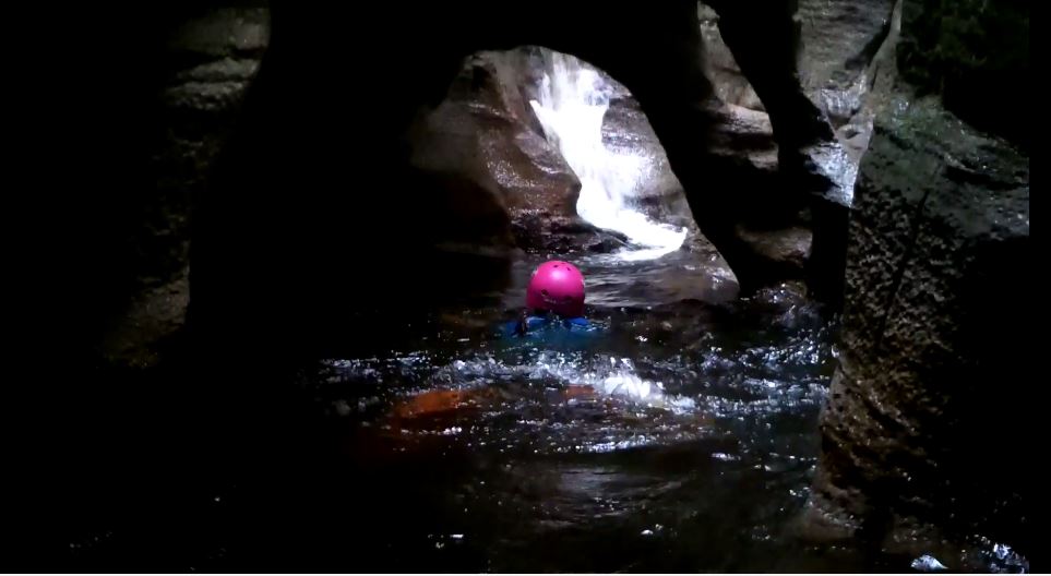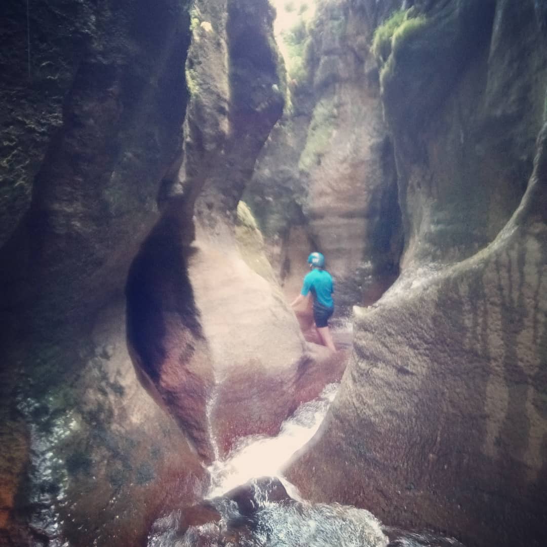A climb down a waterfall leads you deep into the confines and the canyon proper starts. A winding course beneath 10 metre deep walls takes you on a satisfying descent through pools and down rapids. A couple of short wider sections allow the sun to pour in and providing welcome heat. You did choose a scorching sunny day for this trip, right?